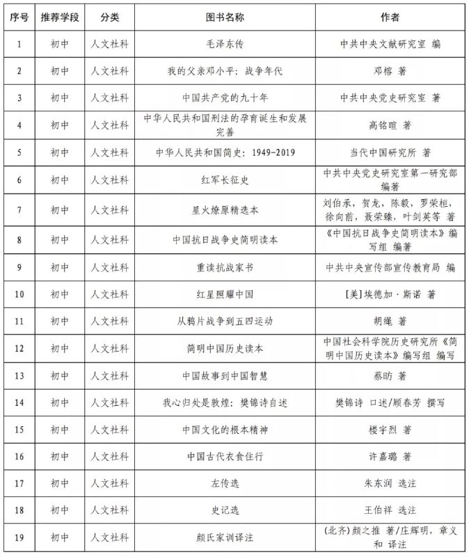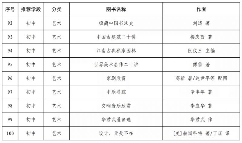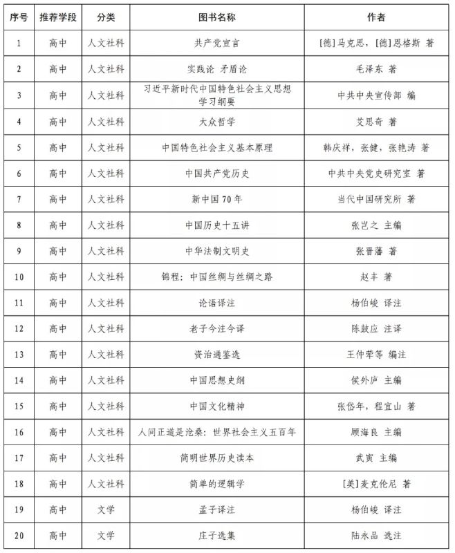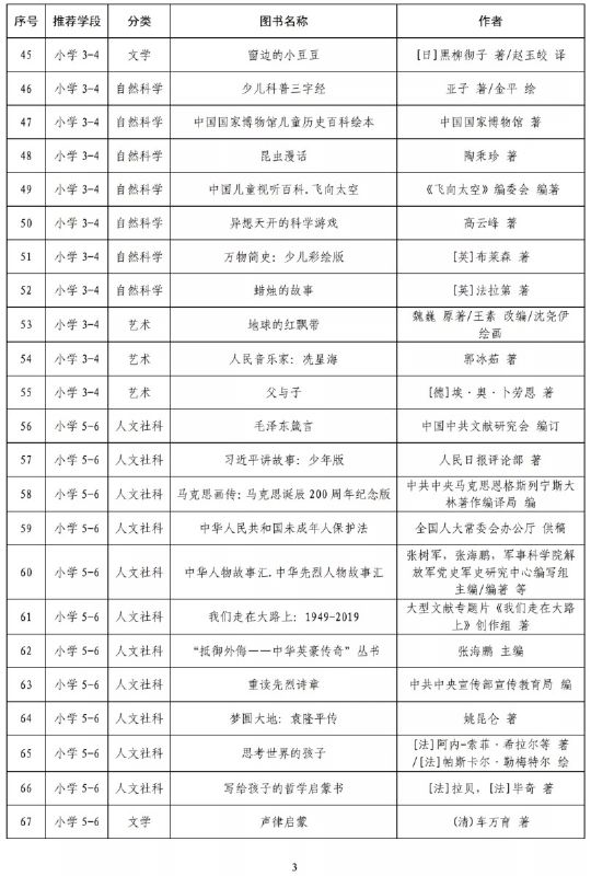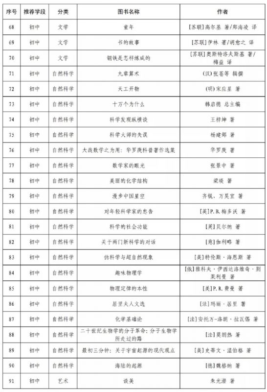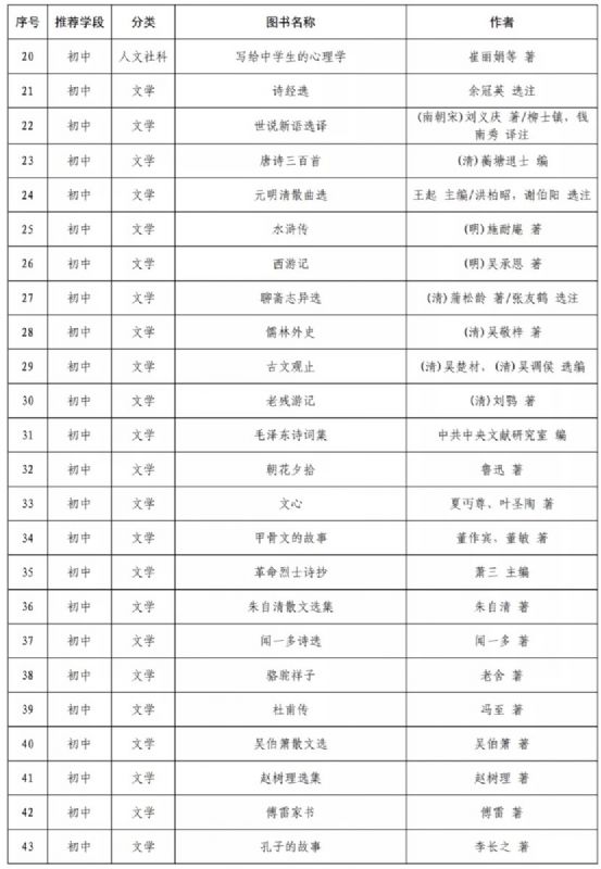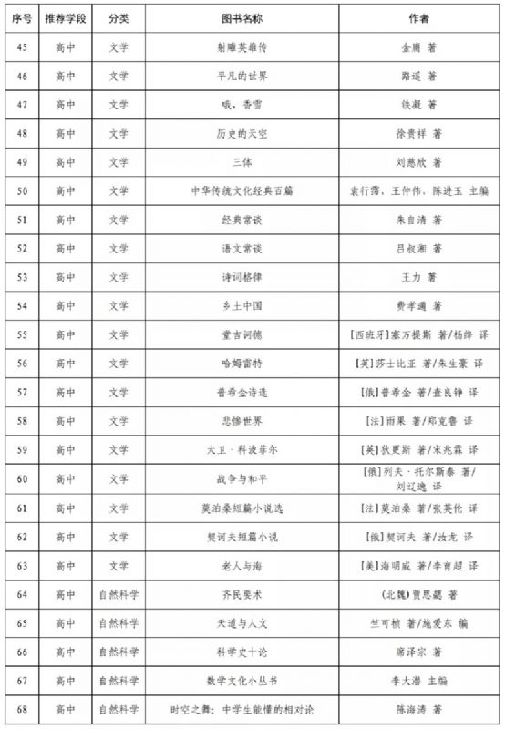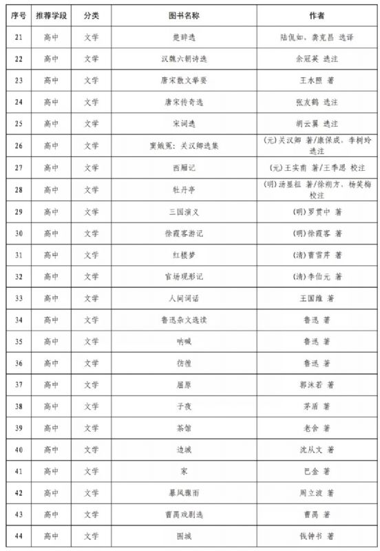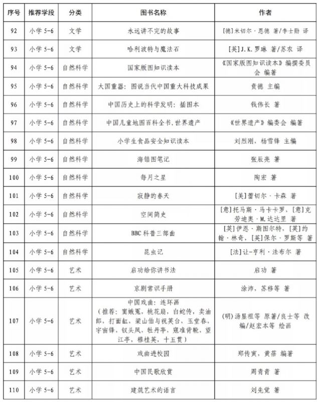 指導目錄分為小學、初中、高中三個學段,其中小學110種、初中100種、高中90種,統(tǒng)籌考慮了中小學生閱讀時間、閱讀特點和閱讀數(shù)量,供學生自主選擇閱讀。