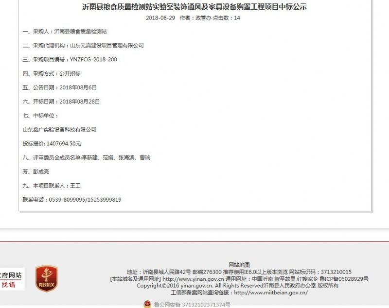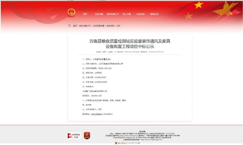 為沂南縣糧食質(zhì)量檢測站定做實驗室家具,實施實驗室工程中標通知