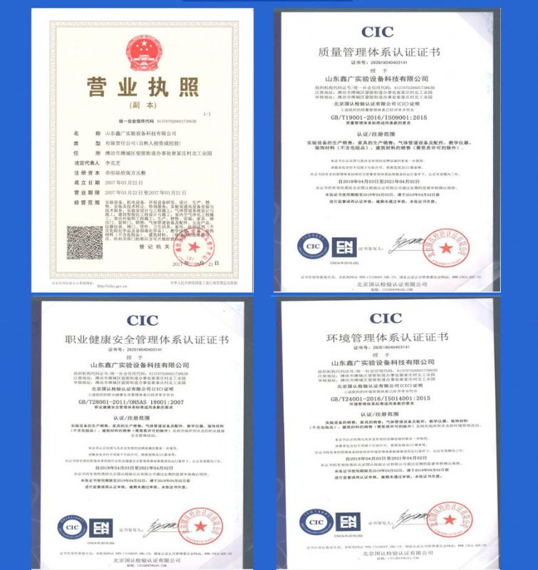 山東鑫廣實驗設備科技有限公司成立于2007年,作為實驗室整體解決方案服務商,提供從實驗室設計、實驗室工程、實驗室家具、實驗室設備、實驗室耗材、到實驗室服務等實驗室建造一站式服務,致力于專業研發、設計、生產實驗室家具等產品及相關配套設備,并提供實驗室建設全套解決方案的新型高科技企業。公司下設研發生產車間、營銷服務中心,在全國拓展分銷網絡和辦事處,為客戶提供更專業、優質的產品和服務。我公司有嚴格的管理制度與規章制度,并且通過了GB/T19001-2000質量管理體系認證和GB/T24001-2004環境管理體系認證。